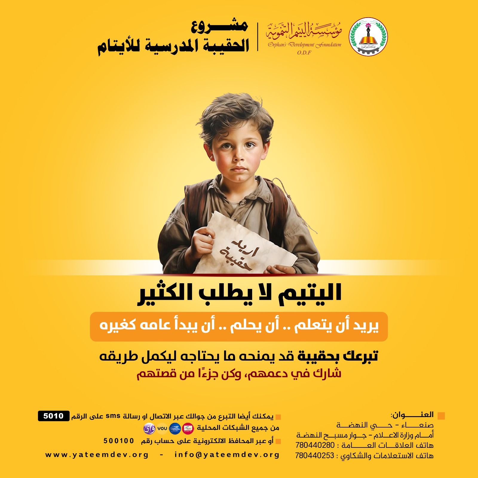 - "لا تدع اليتم يكسر أحلامهم. بوقوفك معهم، تبني جيلاً قوياً ومجتمعاً مزدهراً."